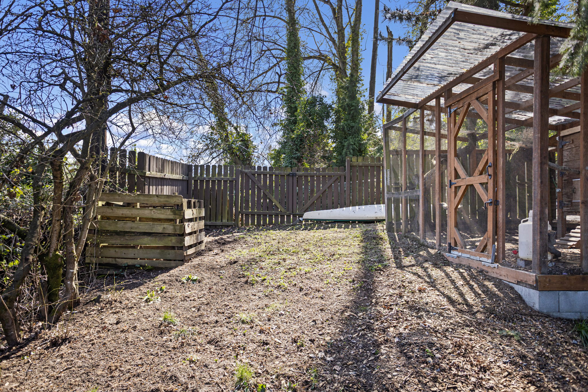 Yard Cobblestone path, fully-fenced, raised garden beds, resin shed, timber-frame chicken coop